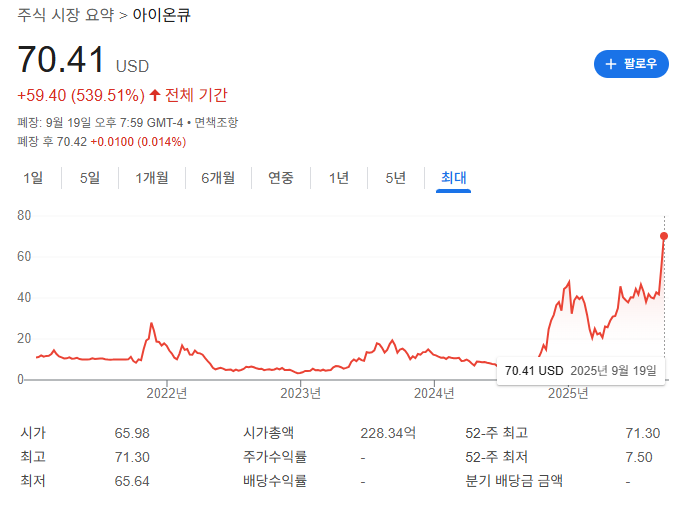 2025년 9월 기준 아이온큐 주가는 70.41달러로 52주 최고치(71.30달러)에 근접한 수준이다. 불과 1년 전 7달러대였던 점을 고려하면 **연간 상승률은 약 756%**에 달한다.